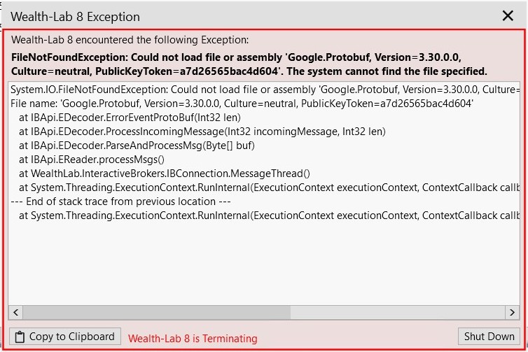 FWIW, I downloaded Wealthlab (build 141) and InteractiveBrokers (build 75) at approximately 5:15am PDT this morning. Received the Wealthlab abort screen pictured at the top of this thread. After reviewing this thread I shut down both Wealthlab and Trader Workstation, copied the GoogleProtbuf.dll as Administrator to C:\Program Files\Quantacula, LLC\Wealthlab 8. I then started Wealthlab, which caused Trader Workstation to be loaded. As soon as I entered my login credentials into Trader Workstation, received the same abort message from Wealthlab. Currently updating a back up PC, but would love to be able to utilize my workstation which is currently DOA with respect to WealthLab.