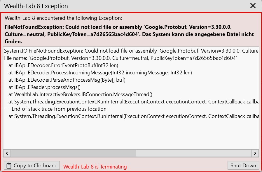The error message appears and then WealthLab crashes completely, meaning I can no longer perform backtesting. I have already restarted the computer, but unfortunately the problem remains. It would be great if a solution could be found before the market opens today, as otherwise I will have a problem...