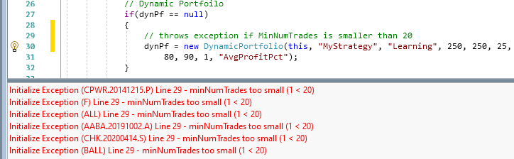 public override void Initialize(BarHistory bars) { indicator1 = bars.Close; indicator2 = new SMA(bars.Close,10); PlotIndicator(indicator2,new WLColor(0,0,0)); _startIndexList.Add(indicator2); // Dynamic Portfoilo if(dynPf == null) { // throws exception if MinNumTrades is smaller than 20 dynPf = new DynamicPortfolio)this, "MyStrategy", "Learning", 250, 250, 25, 80, 90, 1, "AvgProfitPct"); } foreach(IndicatorBase ib in _startIndexList) if (ib.FirstValidIndex > StartIndex) StartIndex = ib.FirstValidIndex; }