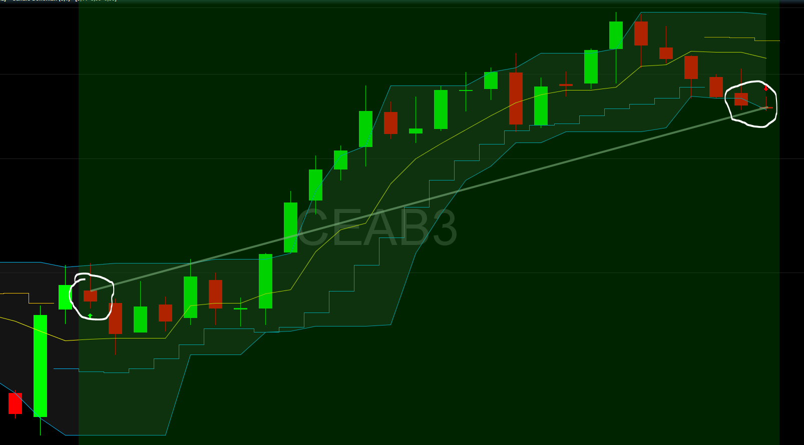3. The price doesn't seem to cross above the Donchian Channel on the right edge of your chart. Rather below. Correct?