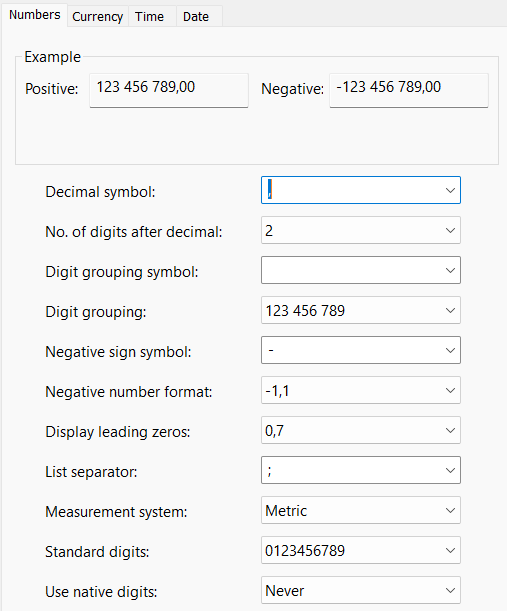 2. What are the decimal and currency separators in Control Panel > Region > Additional Settings > "Numbers" and "Currency" tabs?
