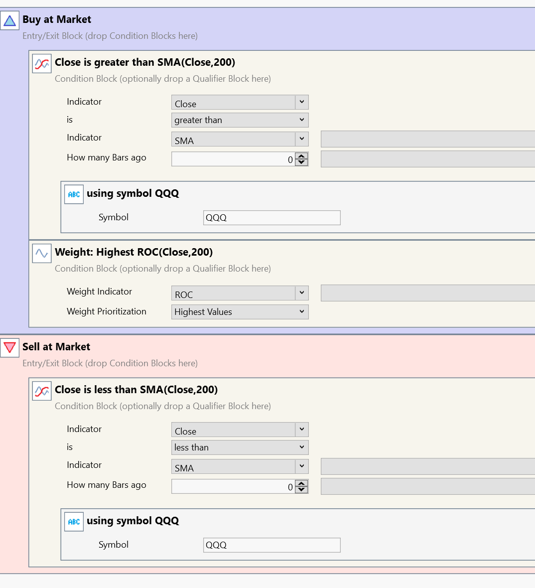I think I understand it now. In your example, the system buys when the closing SMA 200 crosses the QQQ from below. It then buys the securities with the highest ROC values ββ(SMA 200), and sells when the closing SMA 200 crosses below it.