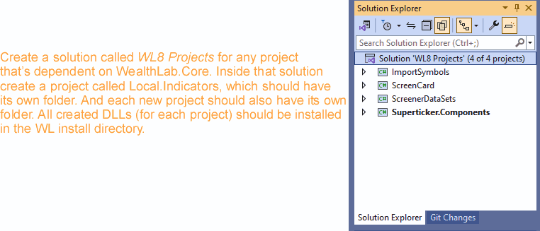 I would create one VS "solution" for all development projects that depend on WealthLab.Core as shown in the screenshot. Each new project must have its own folder there. My own Local.Indicators folder isn't showing there because it has its own solution, which was a mistake. All my class libraries (called by strategies) are in Superticker.Components.