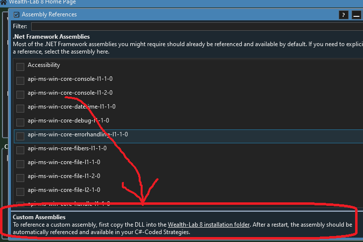 I'm trying to reference my dlls, I copied them into c:\Program Files\Quantacula, LLC\WealthLab 8\, WL8 seems to see the library, as it proposes to add reference to the library (see the screenshot). But if I select this item, it closes and nothing happens. And I can't see the library under Tools -> Assembly References. This is a C#12 library, compiled for Any CPU.