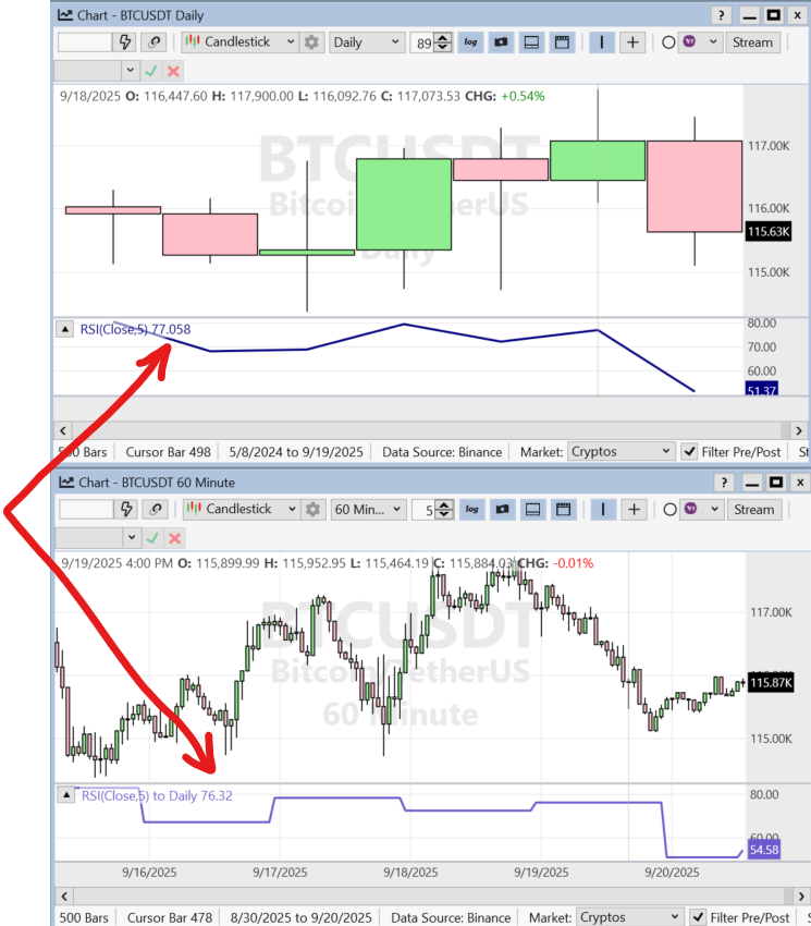 If I understand correctly, the indicator values on the daily chart and the Scaleind (to daily) on the intraday chart should match. But they are different.