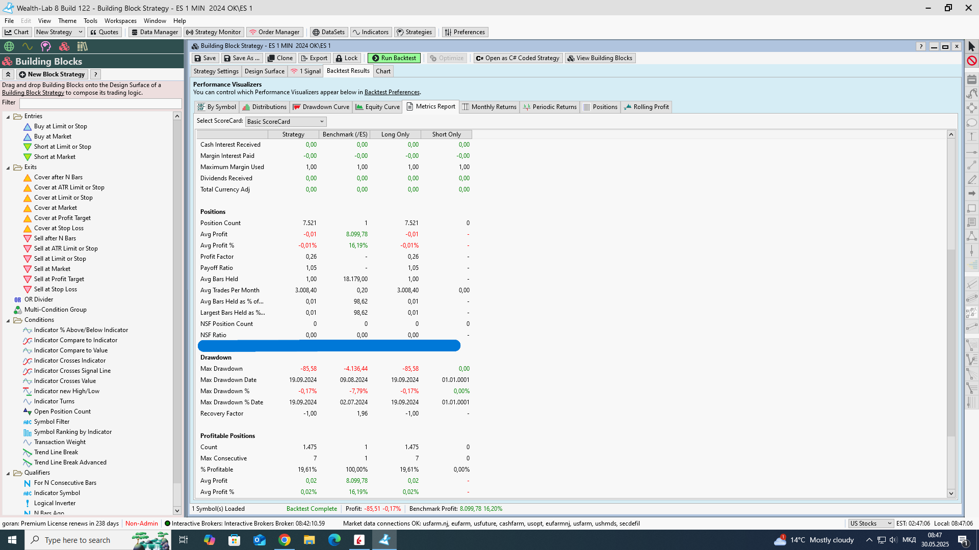 I have downloaded historical data from Interactive Brokers, for futures contracts (I did that a few months ago). Тhen on that historical data using strategy evolver profitable strategies were generated. I saved a few of them (those that gave the best results ).