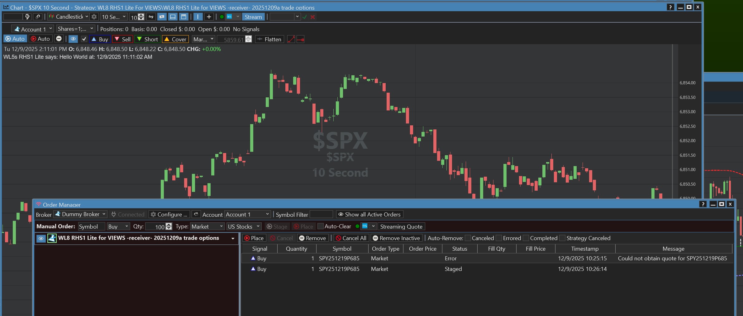 The Dummy Broker requires a provider that can return a chart with a partial bar for quotes for the symbol.