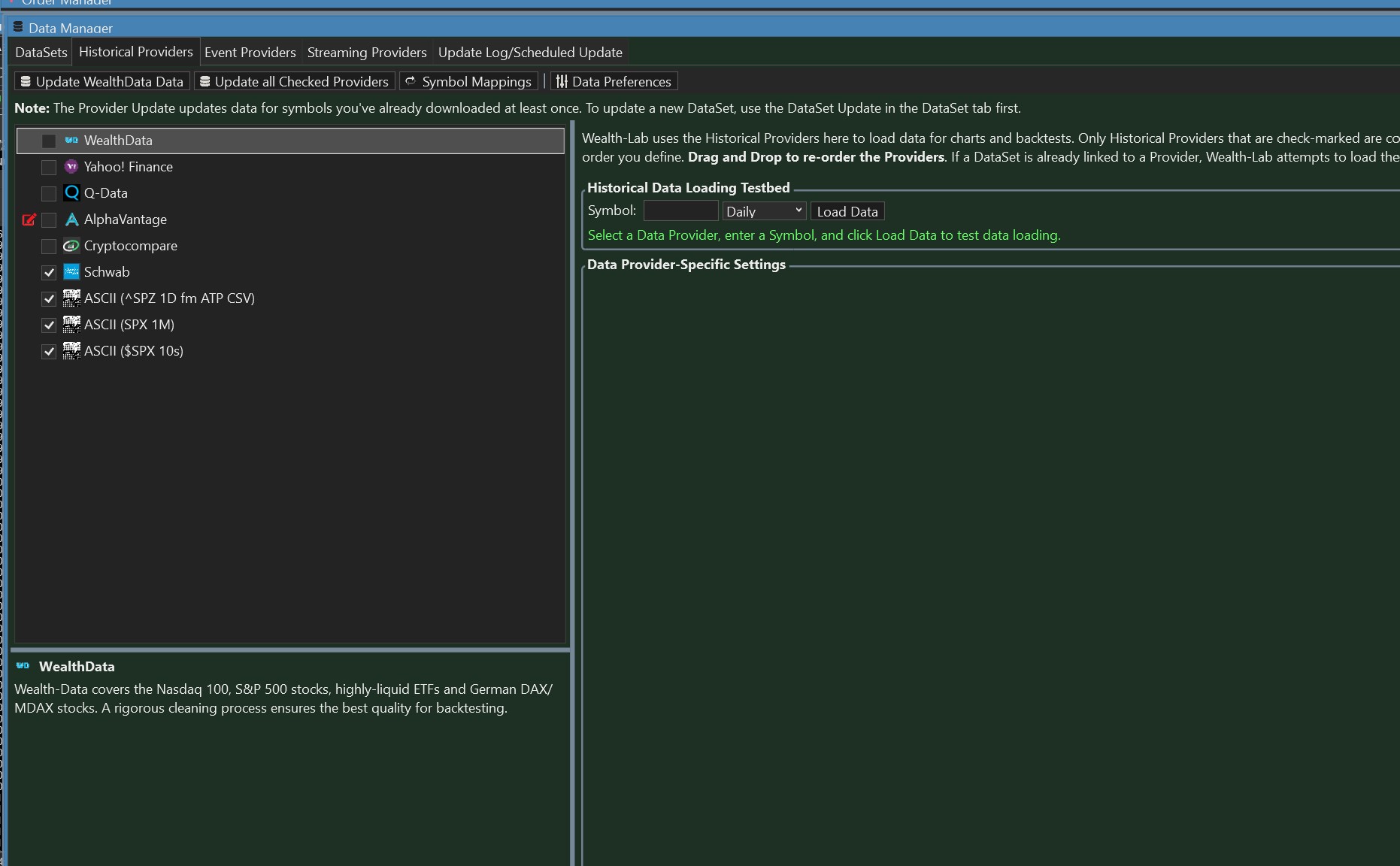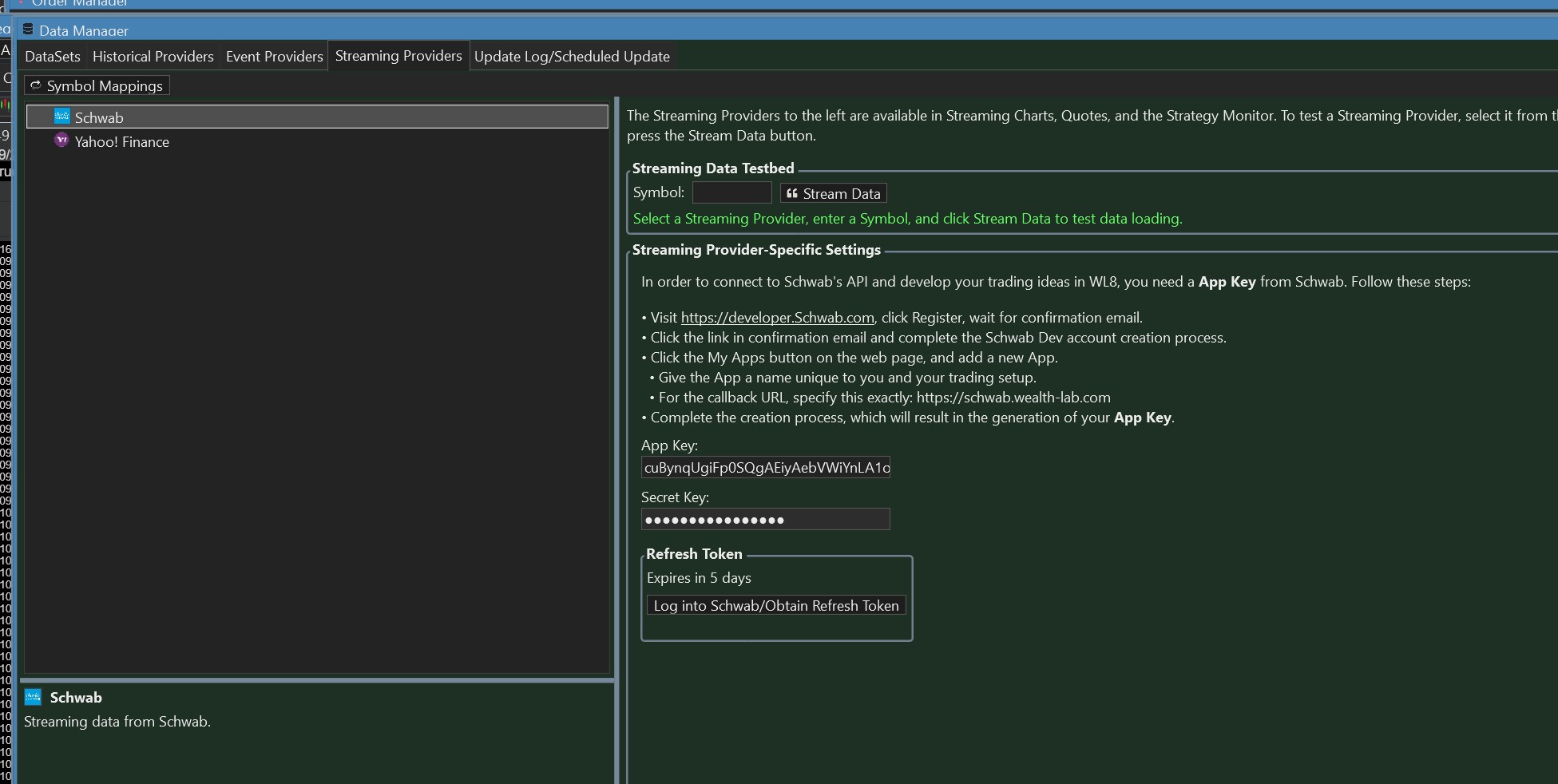Hmm, do you have Schwab enabled (check box checked) in the Data Manager, Historical Providers tab?