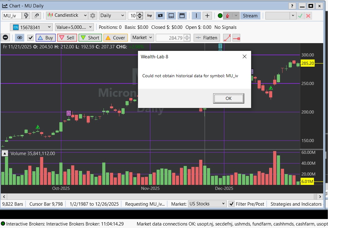 I don't know if I tried to obtain the data when IBKR TWS was not available, and broke something? Is there a way to "force load/re-load" the data? I tried looking in the InteractiveBrokers directory and there was no MU_IV folder to manually delete any corrupted data (there is no data).