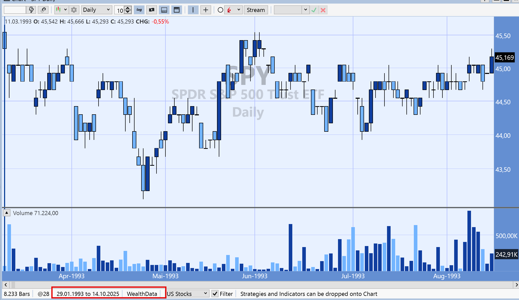 With the overhaul of the WealthData back end WealthData currently does only go back to 2000. VK has cached data for SPY that he accumulated before the transition.
