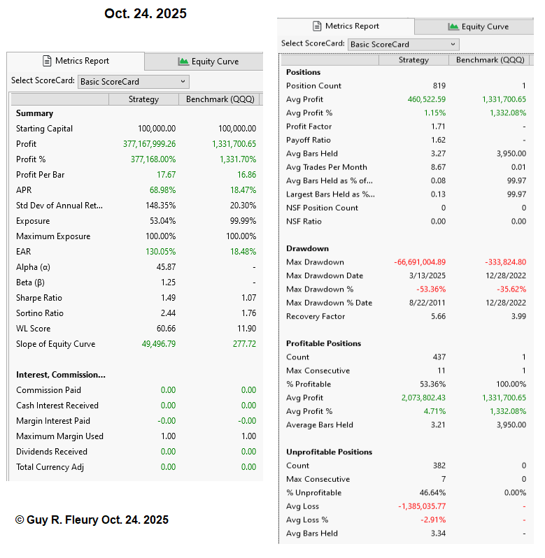Note that Glitch released the OPPW strategy in 2022, and that anyone up to May 2024 could have modified it before I came on the scene. It wasn't simply "Buy Monday's Open". It was part of my gambling trading philosophy. You are playing a compounded return game in which your compensation is subject to your participation, and where randomness plays a major role, so much so that some 48% of your trades do not make a cent.