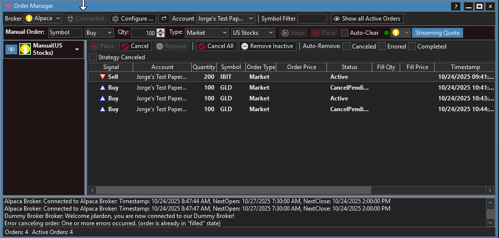 I am testing with the Alpaca Paper Account. Orders that are generated by the streaming chart window through live trade orders or tradeable trend lines are not updating the status as filled and remain in the order manager as active or cancel pending even though the order was actually filled. If you go tot he account and refresh I effectively see the open position but he orders remain without updating the execution status.