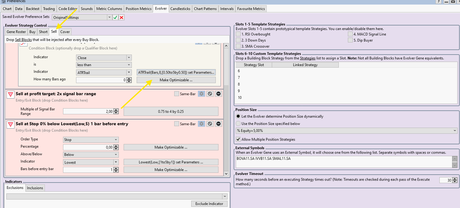 make sure you give the interface enough room horizontally. if it’s not wide enough those buttons will get cut off. anyway, they don’t play a role in the evolver. if you want to optimize something after a strategy is generated, just set it up then.