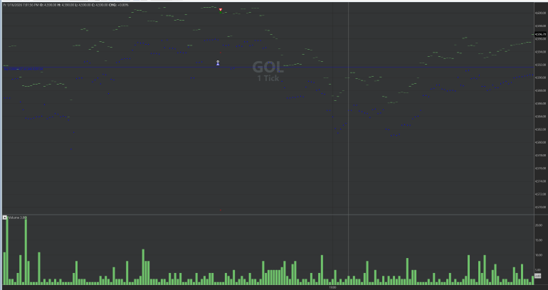 I am working with 1-second bars on Gold futures. I also just tried with tick-level data and got the same result. There is no market closure during the period. Gold futures are obviously highly traded and liquid (about 100 million USD daily volume here). Sometimes there are many trades a second, and sometimes 10 or so seconds between trades. But the gaps in price between bars are pretty constant.