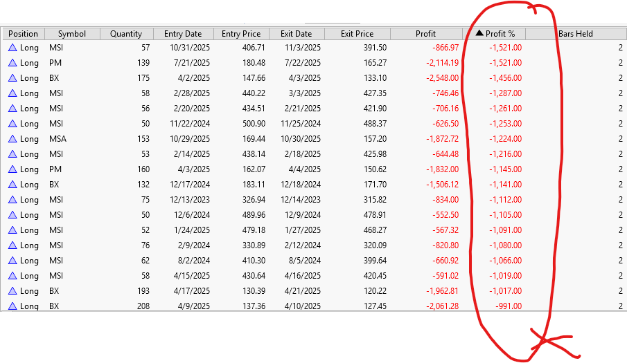 There is very strange bug in Wealthlab 8 build 151. I run a very simple program which buy stock at close and sell next day at close. And run the program on a watch list of 2000 stocks over 3 years, and then sort the "Profit %" tag under position. For large majority of trades, the "Profit %" is calculated correctly according the "Entry Price" and "Exit Price". However, there is always some trades that the "Profit %" is calculated as total wrong. Not sure what is problem. Look like there is some kinds of bugs if run on large dataset. See the attached image.