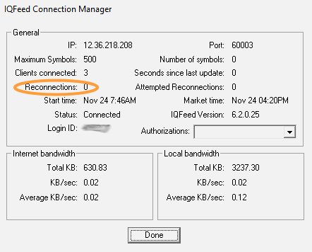 Understand, the connection between the IQFeed connect client and the WL IQFeed provider is a local connection, not over the Internet. If you want to see if the IQFeed connect client is struggling with your Internet connection, you need to open its dialog box to check.