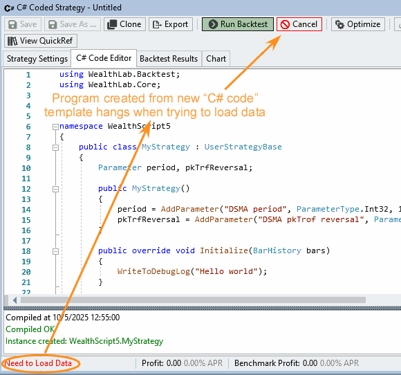 When trying to create a new strategy using the new "C# code" template, the program hangs in the Need to Load Data state. I tried replacing the C# template with the "Hello world" program, but it still can't load data to make the Hello world program execute. This was not a problem in Build 134, but it is a problem with WL Build 138.
