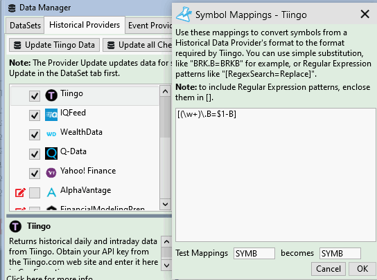 Hmm. I didn't know about the Tiingo symbol remapping requirement. Below is the regexp I'm now using to map Fidelity screener symbols to Tiingo symbols. For example, BRK.B to BRK-B