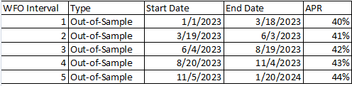 I did not show the resultant equity and resultant APR with that table shown below where the resultant profit and resultant APR utilizing original strategy investment would be if you re-optimized the strategy every WFO interval to match the WFO as intended.