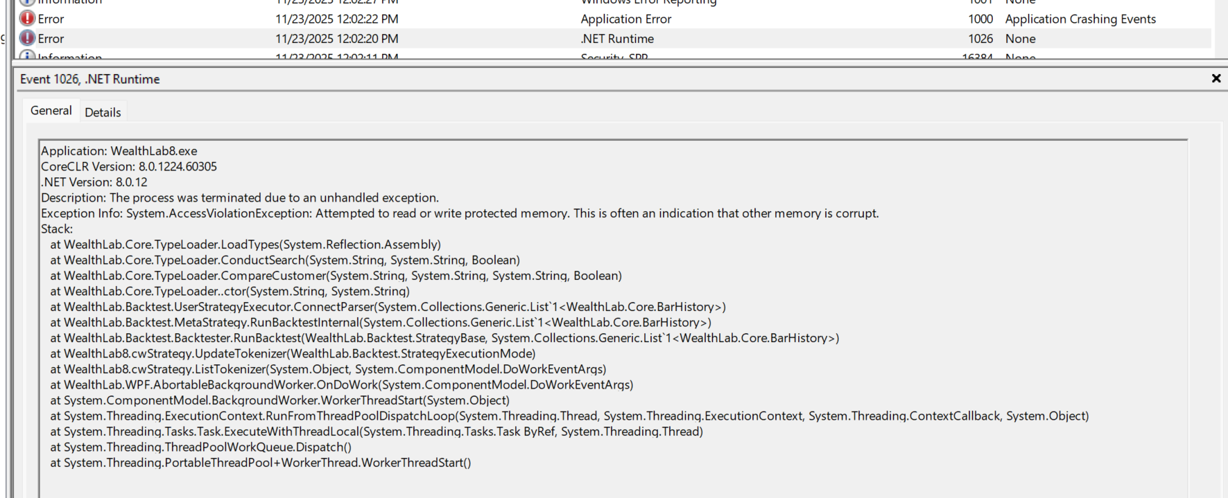 I updated to the newest version of WL one of two days ago, and my Windows desktop restarted last night and had some updates installed. Today WealthLab randomly crashes for a few times (Sometime it crashed while starting, and sometime it crashed while i worked on strategy backtesting). I was able to find the following crash logs from Windows events. Seems there were slightly different for different crash instances . Could the WL developers take a look? Thanks.