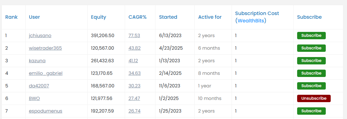 Use your WealthBits to subscribe to members' Wealth$im signals, follow top traders on WealthLab.com, and gain access to exclusive trading insights.