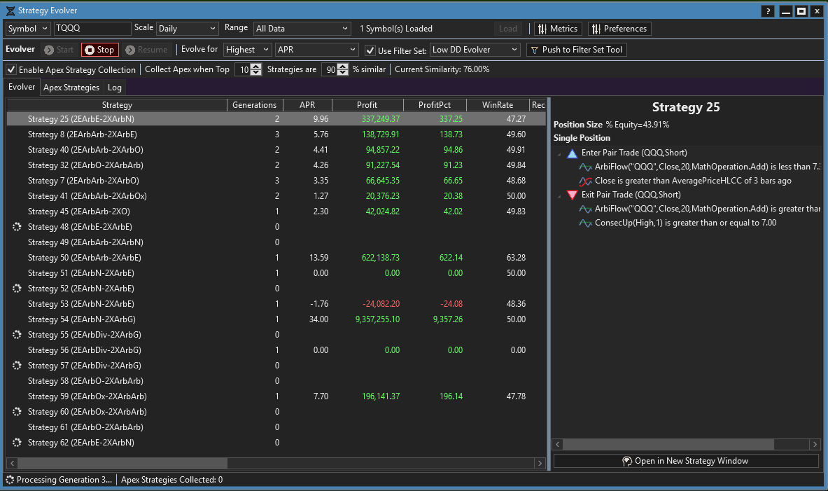 - New Strategy Evolver Genes that let the Evolver use the Pair Entry and Exits along with ArbiFlow.