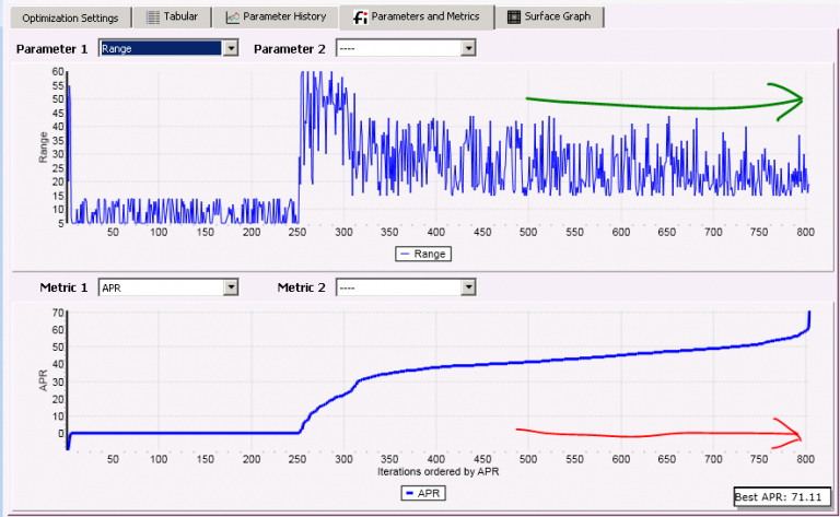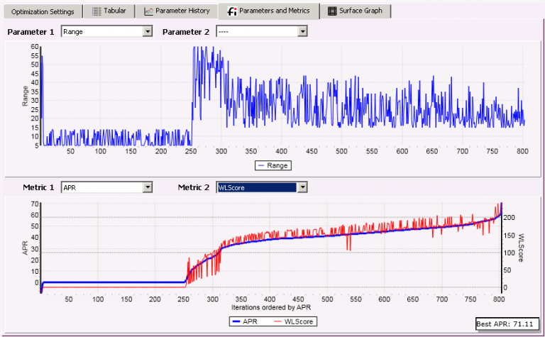 Parameters and Metrics is an Optimization Visualizer Exrension for WealthLab 8. It shows two simple yet powerful graphs which let you understand and interpret the results of an optimization run even if many parameters are involved.